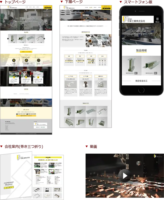 最新の工場設備と職人さんの技術を伝えるため、製品や製造過程の写真と動画撮影を行い、トップページの背景には加工過程の動画を流しております。合わせて、パンフレットもデザインを統一しWebookで閲覧可能としています。