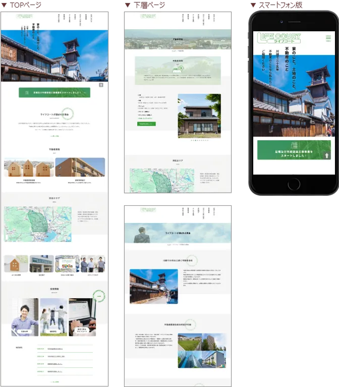 ライフコート様のホームページ制作では、不動産事業と足場事業という異なるターゲットを持つ二軸の事業構造を整理し、ユーザーが目的に応じてスムーズに情報へ到達できる導線設計を行いました。創業35年以上の地域密着の信頼性やフットワークの軽さ、豊富な買取実績といった強みを再定義し、サイト全体で一貫したブランドメッセージを構築。さらに、問い合わせ獲得を意識したUI設計と、将来的な情報拡張にも対応できる柔軟な構造で構築しました。